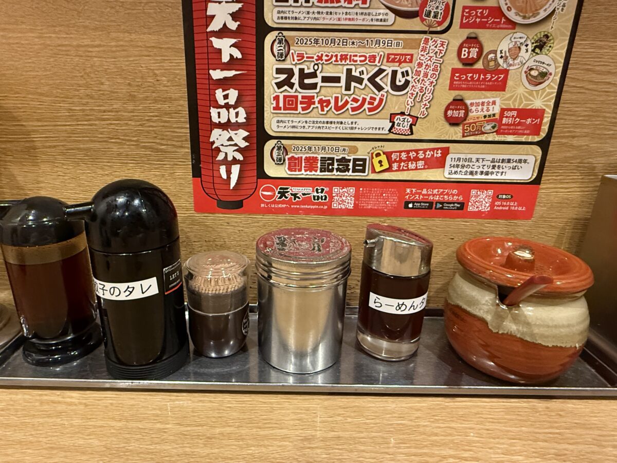 天下一品ではラーメンのタレと豆板醤みたいなものが各テーブルに用意されている。管理人が好きなのはラーメンのタレだ。このタレは酢の要素が強く、こってりスープに酸味を与えることができる。ちょっと最後のほうでこってりに飽きてきたところにフレッシュな酸味が加わるとまた新しいスープに生まれ変わる。