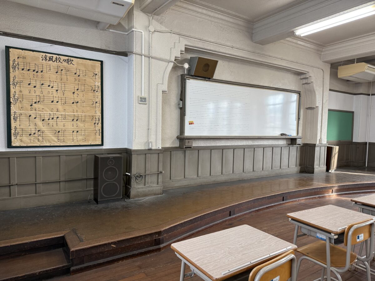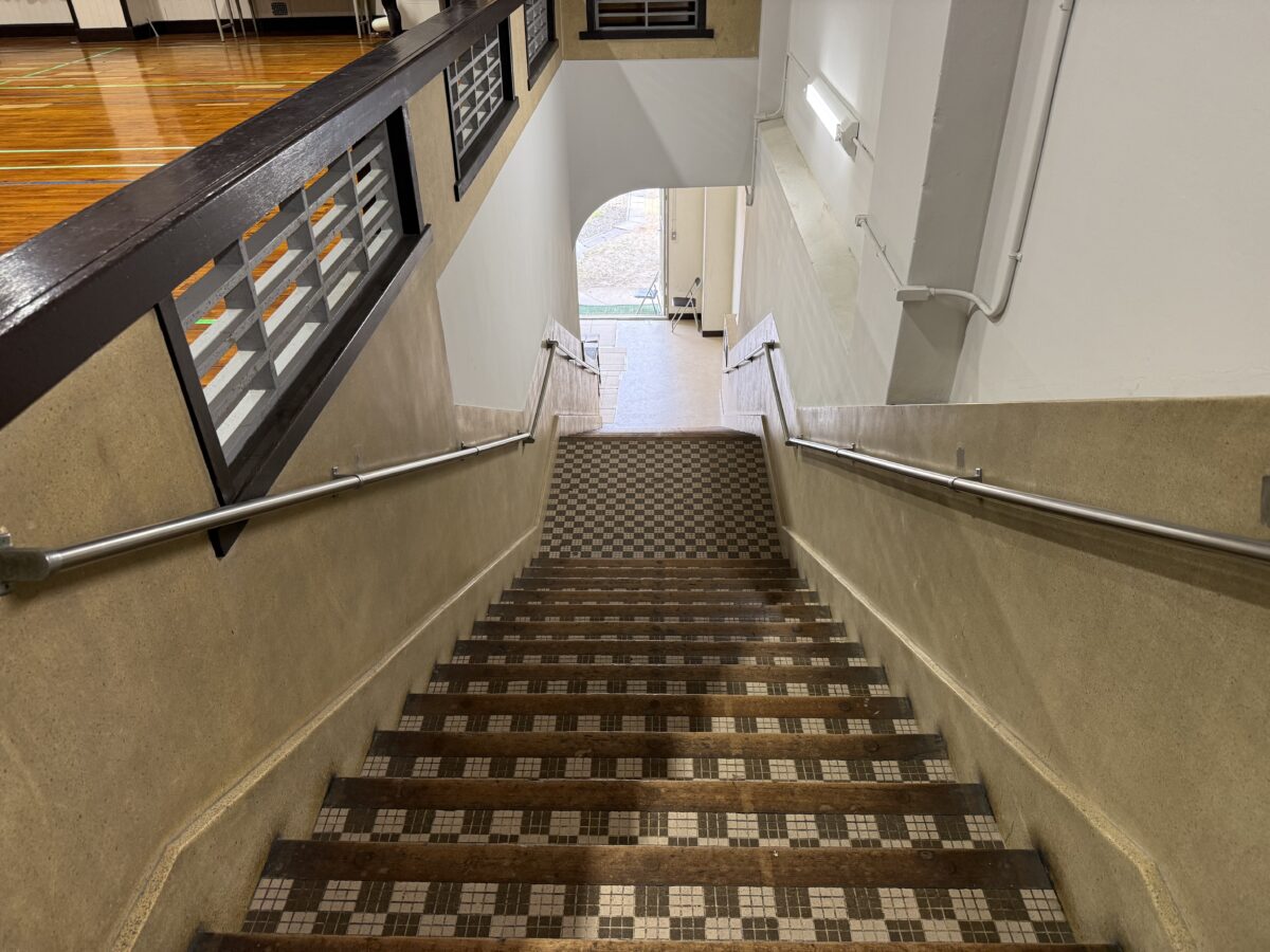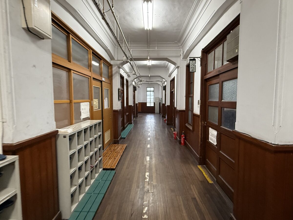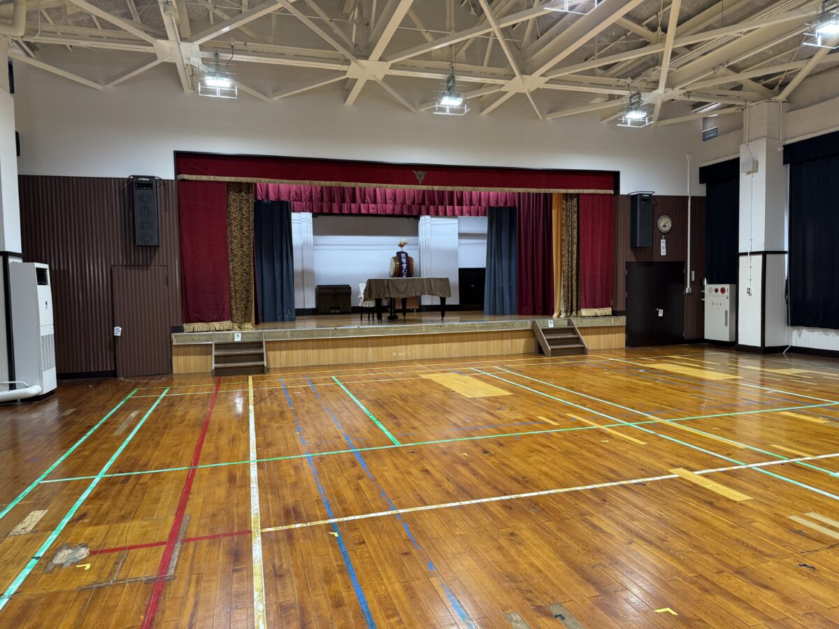 講堂が公開されました。下のテープを見るに体育館としても使われていた感じがします。
