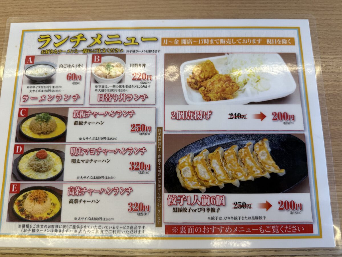 ランチメニューはサイドメニューが通常よりお得に提供。餃子6個が200円はかなり安い。