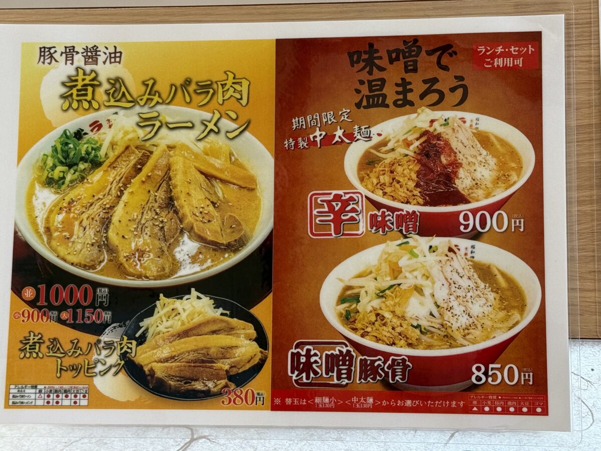 こちらはメニュー。ほとんどが豚骨醤油ベースのラーメンになっている。